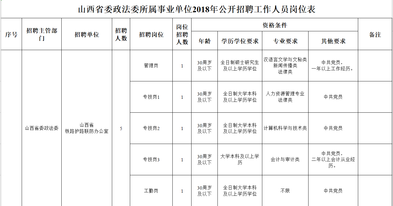 根据工作需要,山西省委政法委所属公益一类事业单位山西省铁路护路联防办公室2018年面向社会公开招聘工作人员,现就有关事项公告如下: