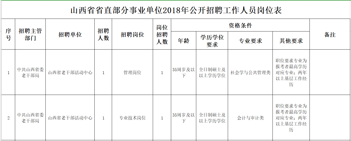 根据工作需要,中共山西省委老干部局所属事业单位山西省老干部活动中心2018年面向社会公开招聘工作人员,现就有关事项公告如下: