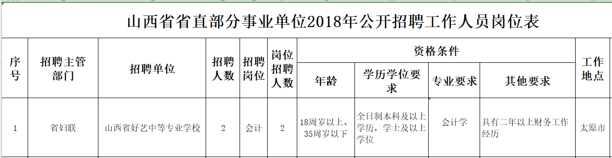 根据工作需要,山西省妇女联合会所属事业单位山西省好艺中等专业学校2018年面向社会公开招聘工作人员,现就有关事项公告如下: