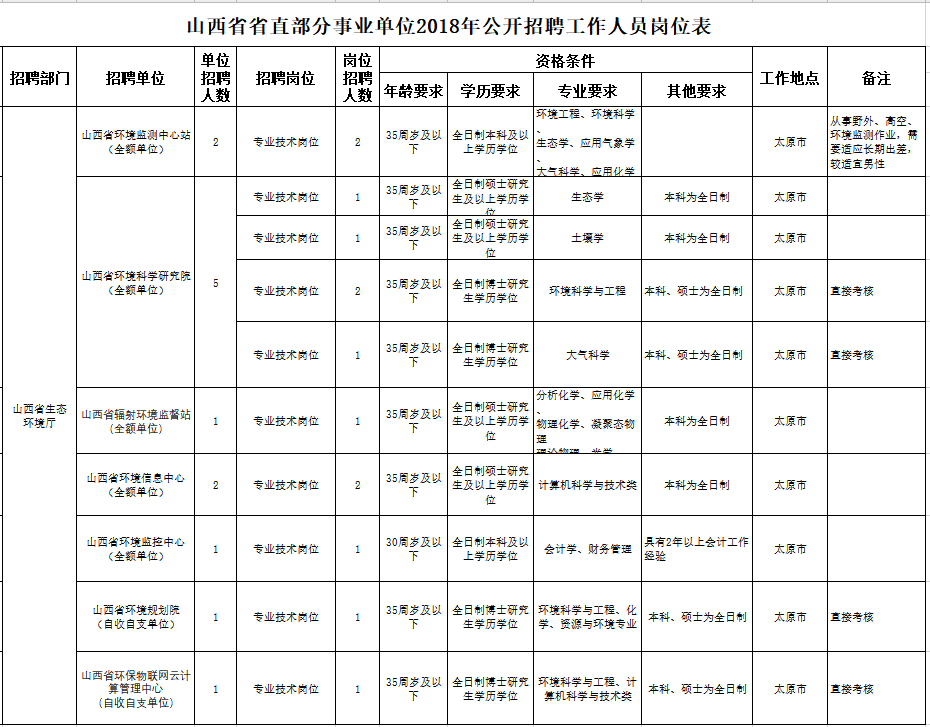 根据工作需要,山西省生态环境厅所属事业单位省环境监测中心站、省环境科学研究院、省辐射环境监督站、省环境信息中心、省环境监控中心、省环境规划院、省环保物联网云计算管理中心2018年面向社会公开招聘工作人员,现就有关事项公告如下: