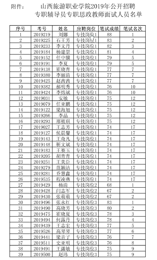根据《山西旅游职业学院2019年专职辅导员、专职思想政治理论课教师公开招聘方案》,经学院研究决定2019年公开招聘专职辅导员、专职思想政治理论课教师面试于2019年12月1日进行,现将具体事宜通知如下: