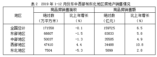 2019年1-12月份,全国房地产开发投资132194亿元,比上年増长9.9%,增速比上年加快0.4个百分点。其中,住宅投资97071亿元,增长13.9%,增速比上年加快0.5个百分点。2019年,商品房销售面积171558万平方米,比上年下降0.1%。其中,住宅销售面积增长1.5%。办公楼销售面积下降14.7%,商业营业用房销售面积下降15.0%。商品房销售额159725亿元,增长6.5%,增速比上年回落5.7个百分点。其中,住宅销售额增长10.3%,办公楼销售额下降15.1%,商业营业用房销售额下降16.5%。