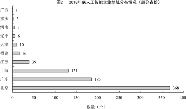 截至2018年底,中国人工智能市场规模约为238.2亿元,同比增长率达到56.6%。从中国人工智能企业地域分布情况来看,北京企业数量最多,企业数量为368家;其次为广东,人工智能企业数量为185家;排名第三的是上海,数量为131家。