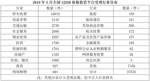 2019年5月,全国12358价格监管平台受理价格举报、投诉、咨询共计37576件,同比下降40.70%,环比下降9.31%。其中,价格举报4192件,环比下降19.06%;价格投诉2059件,环比下降15.92%;价格咨询31325件,环比下降7.34%。平台受理量排名前十的省份依次是北京(5786件)、江苏(3528件)、上海(2499件)、重庆(2486件)、河南(2469件)、陕西(2440件)、浙江(2321件)、天津(1571件)、福建(1483件)、广西(1309件)。平台受理量行业分布如下表所示: