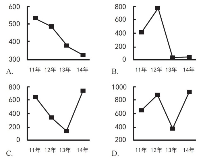 119.以下哪项的折线图可以准确表现2011~2014年间,我国会展业总产值同比增量的变化情况(单位:亿元)?