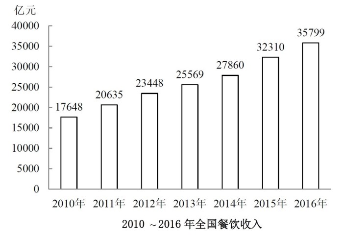 2016年全国餐饮收入35799亿元,同比增长10.8%,餐饮收入占社会消费品零售总额的比重为10.8%。2016年全社会餐饮业经营单位为365.5万个,同比下降8.2%;从业人数为1846.0万人,同比增长5.7%。