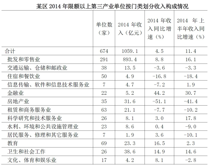 2014年某区限额以上第三产业单位共674家,实际收入1059.1亿元,同比增长4.5%;实现利润总额13.5亿元,同比增长11.9%;从业人员达到58631人,同比下降4.3%。