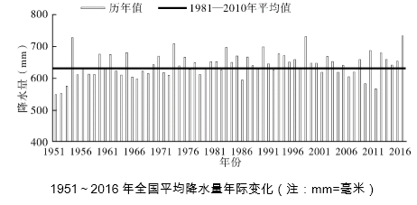 2016年,我国年降水量范围为3.5毫米(新疆托克逊)~2494.4毫米(安徽黄山),全国平均降水量730.0毫米,较常年(629.9毫米)偏多16%,比2015年偏多13%,o 1951年以来最多。2月和8月降水偏少,3月接近常年同期,其余各月均偏多,其中1月偏多94%、10月偏多55%,均为历史同期最多。
