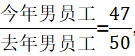 【有课解析】突破口:百分数。从问题出发,所求为今年男员工有多少人,与之对应的信息是:“今年男员工人数比去年减少6%”,由此信息可知,今年男员工人数是去年的94%,据此列式为:,由此可知,今年男员工的人数能被47整除,结合选项,只有A符合条件。正确答案A。