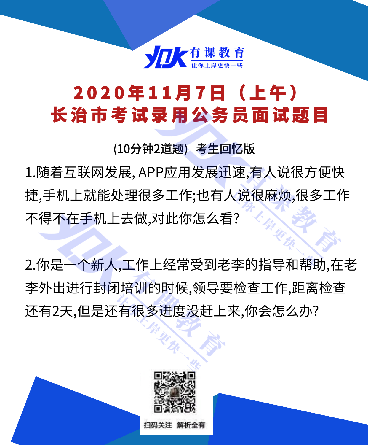 2020年11月7日 长治市考试录用公务员面试题目(上午)