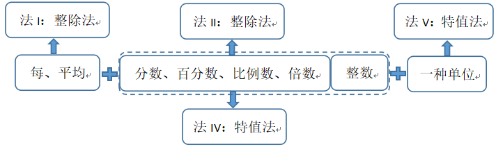 切记!先看数字本身(包括分数、百分数、比例数、倍数和整数),如果存在前四类,结合问题,优先考虑用整除法去做;如果所有的数据均是以前四类形式出现,则考虑用特值法去做;再看数字的前缀和后缀,如果前缀出现“每”、“平均”考虑整除法;如果后缀出现同一种单位,优先用特值法。