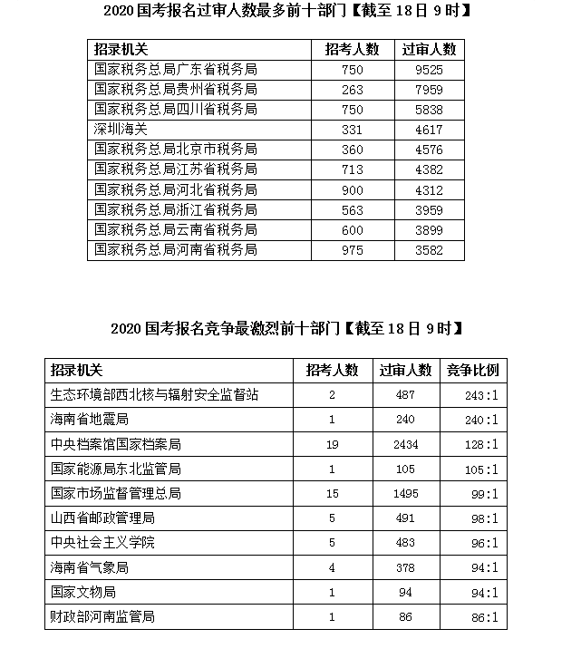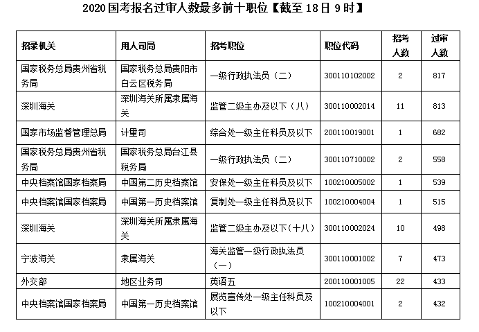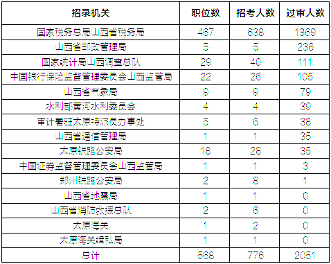 截止到17日9时,通过审核人数前三位的部门依次是:国家税务总局山西省税务局、山西省邮政管理局、国家统计局山西调查总队,三部门通过审核总人数达1716人,占通过审核总人数的83.7%。