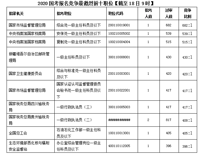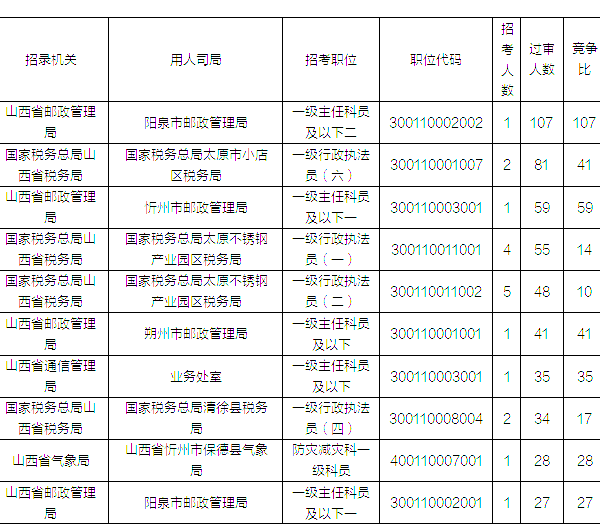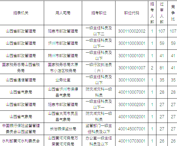 截止到17日9时,竞争比例最高的职位为山西省邮政管理局阳泉市邮政管理局一级主任科员及以下二一职,招录1人,截止到17日9时通过人数为107人!