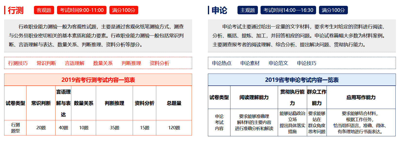 行测:行政职业能力测验一般为客观性试题,主要是通过客观化纸笔测验方式,测查与公务员职业密切相关的基本素质和能力要素。行政职业能力测验一般包括常识判断、言语理解与表达、数量关系、判断推理、资料分析等部分。