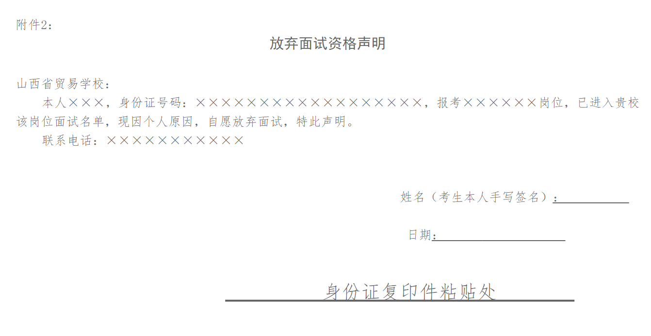 2.资格复审开始前,若取得面试资格的人员确认不参加资格复审的,须签署“放弃面试资格说明”(附件2)。