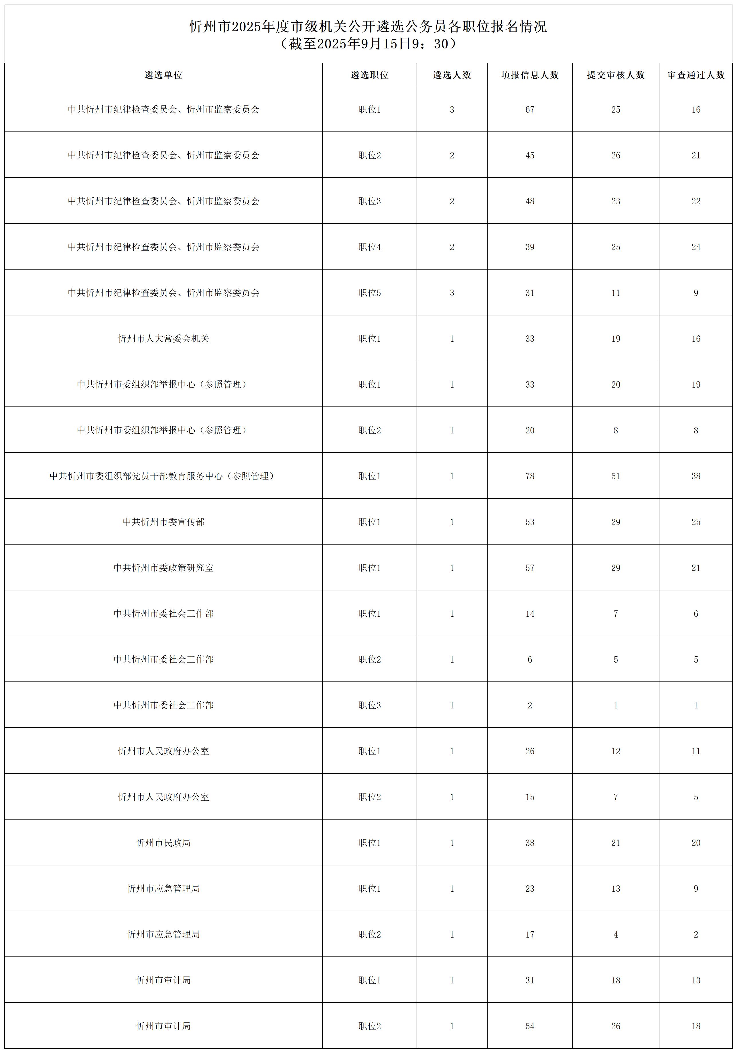 忻州市2025年度市级机关公开遴选公务员各职位报名情况(截至2025年9月15日09:30)